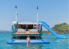 Having fun with water slide, paddle board and other toys